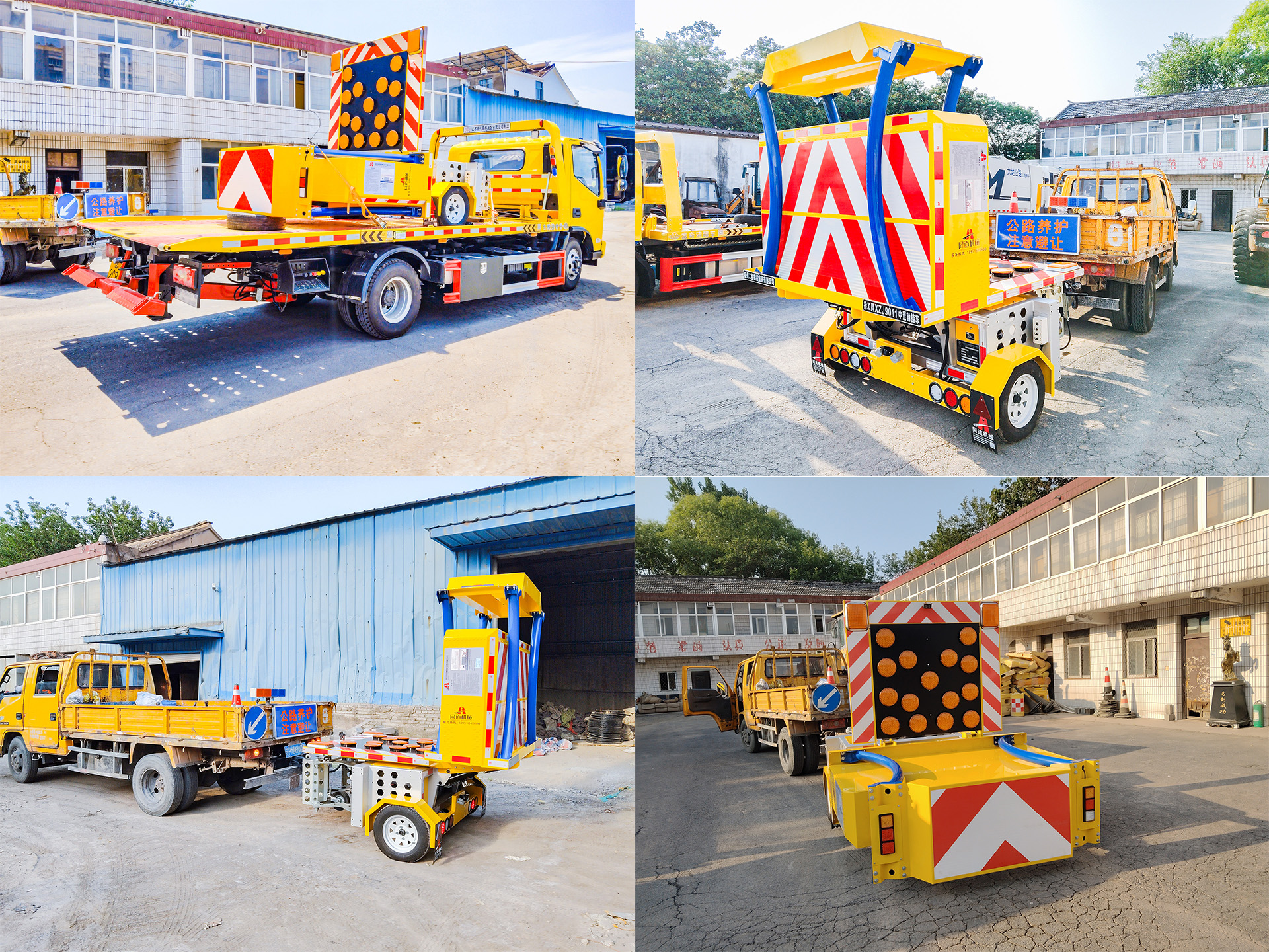 这款拖挂式防撞缓冲车符合NCHRP-350防撞标准,采用轻质铝合金板材制造,中间填充有铝合金薄膜蜂窝吸能材料,外部安装了双段式共四条弧形铝管结构。当发生碰撞时,这些设计能有效吸收2000kg-70km/h标准下的巨大冲击能量,全方位保护施工人员与设备安全。同时,车辆采用全铝合金框架及电泳防锈钢结构,整车仅重740kg,配备电驱动行走轮和可调高度牵引钩(450-900mm),装卸便捷。独特的翻转式防撞垫设计可将拖挂长度缩短至2.3米,大幅提升转弯灵活性,为施工区域提供更高效的安全保障。